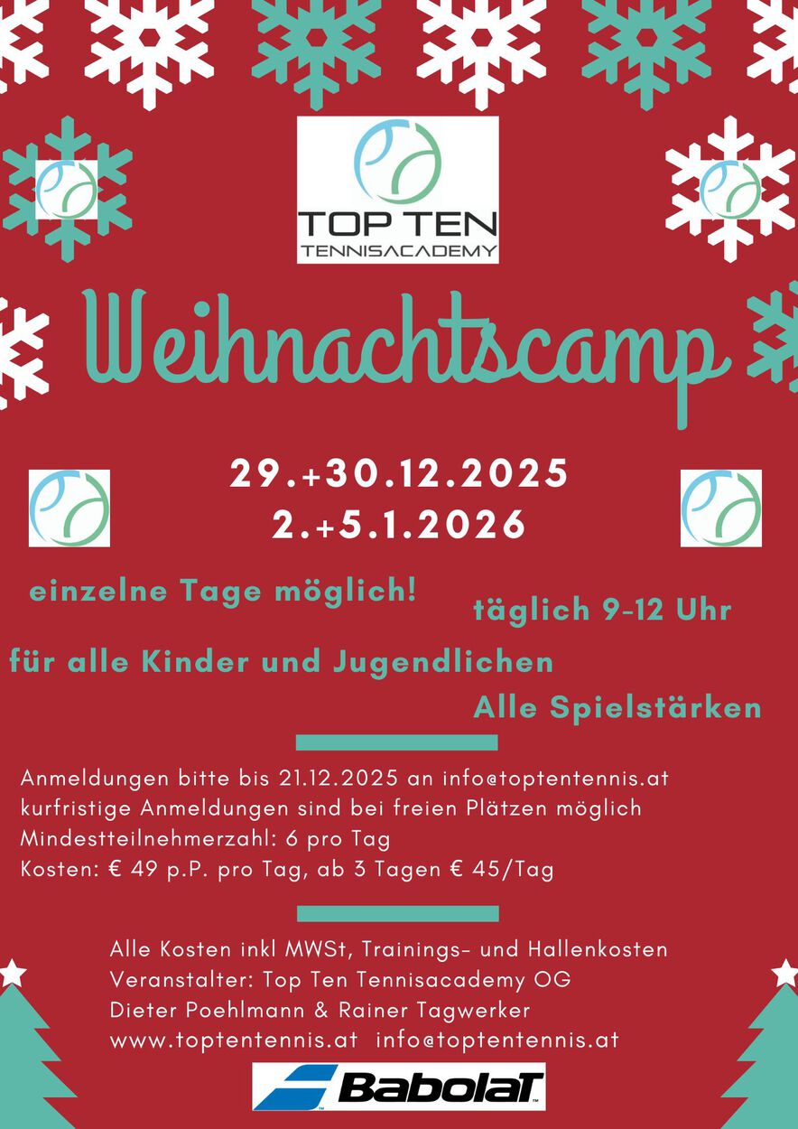 Anmeldungen bitte bis 21.12. per email an info@toptentennis.at Danach bei freien Plätzen!